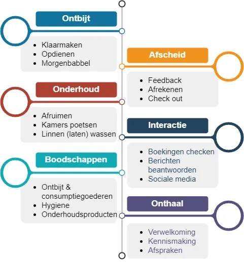 De dagelijkse operationele cyclus van een host noemen sommigen wat liederlijk: de choreografie van gastvrijheid. Deze choreografie willen wij zo duurzaam mogelijk laten verlopen. Hieronder een voorbeeld van een B&B (met ontbijt, zonder lunch of diner)