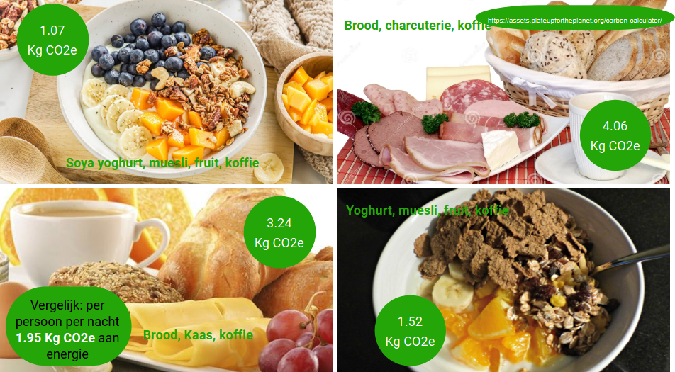 In veel logies zorgt het ontbijt nu al voor een grotere impact dan alle energie samen gedurende het verblijf (verwarming/koeling/sanitair warm water/verlichting …). De keuze van de ingrediënten is daarbij van belang. Hoe meer dierlijke producten hoe groter je uitstoot. Om na te gaan hoeveel je uitstoot met jouw ontbijt: kijk eens op deze site. Heb je graag dat wij een analyse doen? Kan ook. Surf eens naar ons Duurzaamheidsanalyse aanbod.